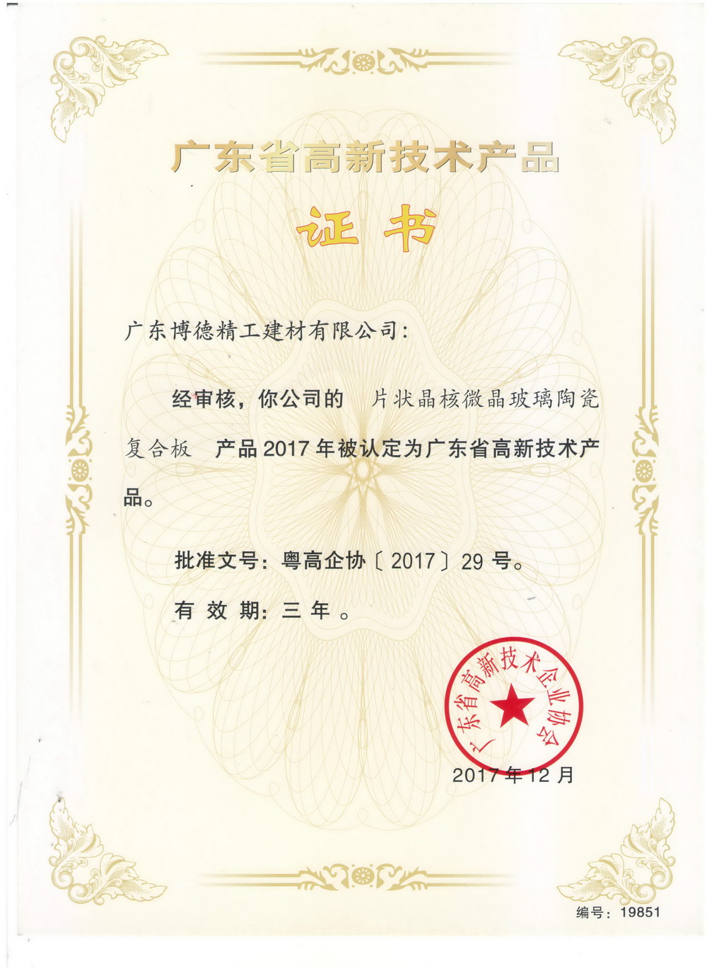 2017年 广东省高新技术花季传媒黄色网站证书(片状晶核微晶玻璃陶瓷复合板)